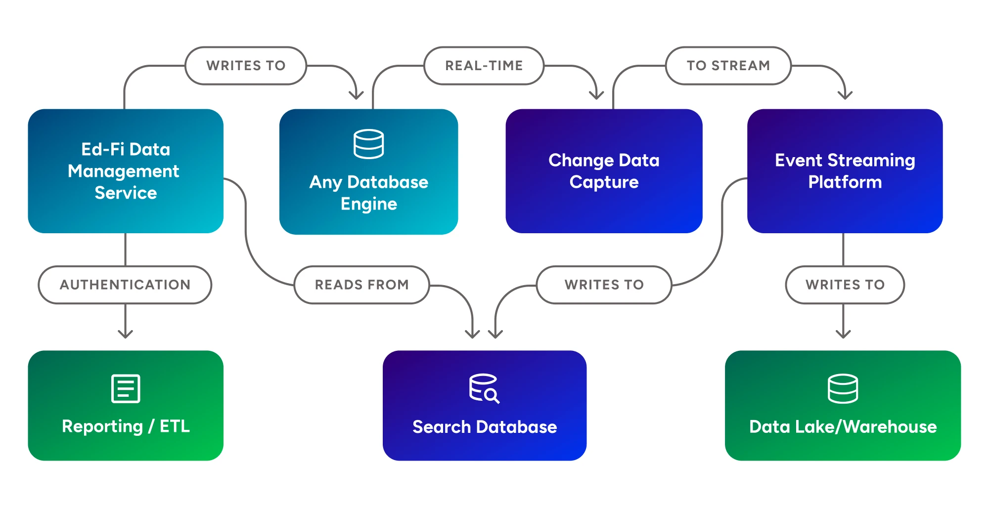 Figure 2: diagram of a possible system architecture for an Ed-Fi API application, which supports real-time population of a data lake and uses a high-performance search database.